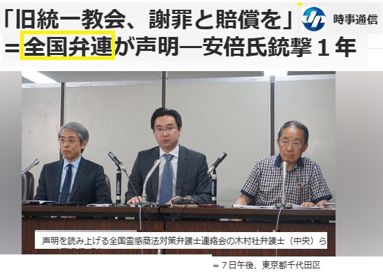 世界平和統一家庭連合(旧統一教会)の高額献金問題を追及する全国霊感商法対策弁護士連絡会(全国弁連)は7日、安倍晋三元首相銃撃事件から1年となるのに合わせて声明を出した。教団に対して被害者への謝罪と損害賠償を求めたほか、速やかに解散命令を裁判所に請求するよう文化庁に要望した。