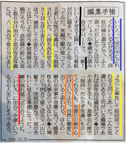 だが、「編集手帳」は、秀逸なものばかりか?と問うと、(私からみて)出来の悪い、疑問符のつく例がないわけではない。そんな例の一つが「『いい人』に出会う幸運」について書かれた2024年12月23日の「編集手帳」だ。