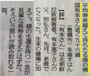 そして、三首目は、5・7・7を無視して、拉致被害者の父親の無念をうたったもの。