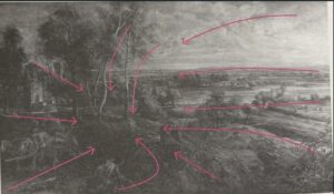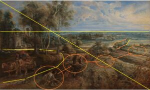 では、ルーベンスの「ステーンの城の見える秋の風景、早朝」(1636年頃)のフォーカルポイントは何処か?