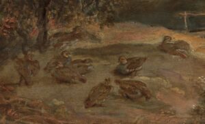 「猟師・猟犬―巨木の根―獲物の鳥―乳牛と農夫」というのどかな田園風景ではないか。
