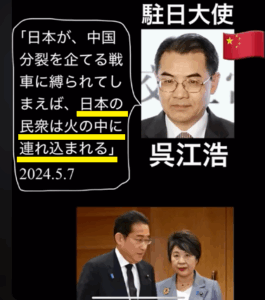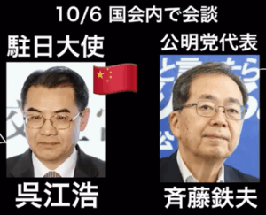 自民党総裁選が近づいた10月6日のタイミングで、中国共産党配下の駐日大使・呉江浩(ごこうこう)が、何故か、突如、国会内に現れ、斉藤鉄夫代表(公明党)に面談を求め、同代表となにやら密談した。この呉江浩なる人物は、昨年、現職の中国の大使が、駐日大使館にて、「日本が台湾問題に口出ししたら、『日本の民衆は火の中へ連れ込まれる』=戦争の惨禍にみまわれる。」と公言・恫喝した人物として知られる。こんな人物を「ペルソナ・ノン・グラータ(受け容れ難い人物)」として。国外退去させず、中国に断固抗議もせず、野放しにしたのが、岸田政権下の上川陽子(当時、外務大臣)である。