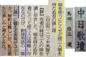 姪を、野球用語「隠し球」に喩える趣旨いかん。
