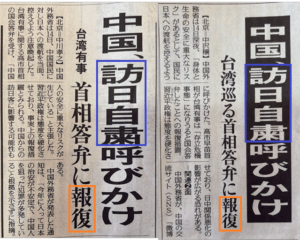 日本国あるいは日本人にとっては、実に喜ばしい、中国外務省の「訪日自粛」の呼びかけであるにもかかわらず、「報復」であるといった、失笑をかうような報道のためめに、何故マスコミ各社が一面の紙面を割くのか? 善意にとれば、中国外務省の意図を「推察」して、高市首相の「失言」の副作用として報道しているのかもしれないが、むしろ中国外務省=中国共産党から、高市首相の「台湾有事は日本有事」「存立危機事態」発言が、中国共産党にとって著しく不快であって、「報復してんだ」という(的外れな)PRをせよ、という指令が、中国共産党から、「中国共産党に侵食された」日本のマスコミ各社に出されたからではないのか? 中国共産党が、「公明党を自民党から離脱させることが、自民党=高市政権にとってのダメージになる」といった的外れな誤解から、先般、公明党に連立離脱を指示したように。