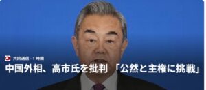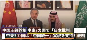 「テレ朝」によると、「王毅外相は12日から16日までの日程で、アラブ首長国連邦、サウジアラビア、ヨルダンの3カ国を訪問しました。中国外務省によりますと、この3カ国に対して、高市総理の発言を念頭に「日本の現職指導者が台湾問題で中国の内政に干渉することに断固反対する」と日本を批判したということです。また、この3カ国は「1つの中国」の原則を堅持し、中国の国家統一の実現を支持すると述べたということです。」