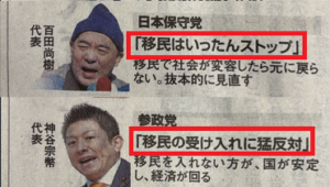 じつは、真に日本の将来を憂い、日本の伝統・国体を護るのであれば、「反移民」の是非こそを、真の対立軸にすべきである。だが、「移民問題」を正面から問うているのは、日本保守党と参政党に限られる。高市さんは、党内野党を意識したためか、国籍要件等の厳格化を言及するにとどめ、「移民問題」への言及を避けている。このまま、移民が無秩序に増えていくと、日本社会が変質してしまうことは、ほぼ間違いないであろう。このことは、移民大国:ドイツ、イギリス、北欧の現実をみれば、明らかである。