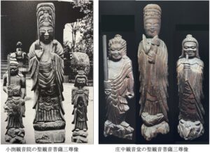 円空が関東巡錫を開始した際、最初に手掛けた作品が、不動院(現在廃寺)の不動明王像であったとしても(小島入門71頁参照)、関東巡錫の比較的早い時期に、小渕観音院(埼玉県春日部市)にて、大作の聖観音菩薩三尊像(上掲・左)を造顕したと考えられる。ここで思い当たるのが、この聖観音菩薩三尊像の構成である。聖観音・不動明王・毘沙門天で構成された「特異な」三尊形式である。このような円空独自の三尊形式は、実は、庄中観音堂の三尊形式(上掲・右)とも共通しており、像容も基本的に共通している。