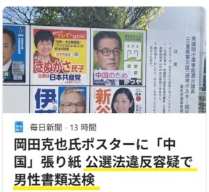 三重県警桑名署は4日、桑名市の50代男性を公職選挙法違反(自由妨害)の疑いで書類送検した。……県警によると、1月28日に通行人が発見し、桑名署に通報。2月6日に岡田氏の事務所からの被害届を受理し、防犯カメラなどの映像で50代男性を特定した。